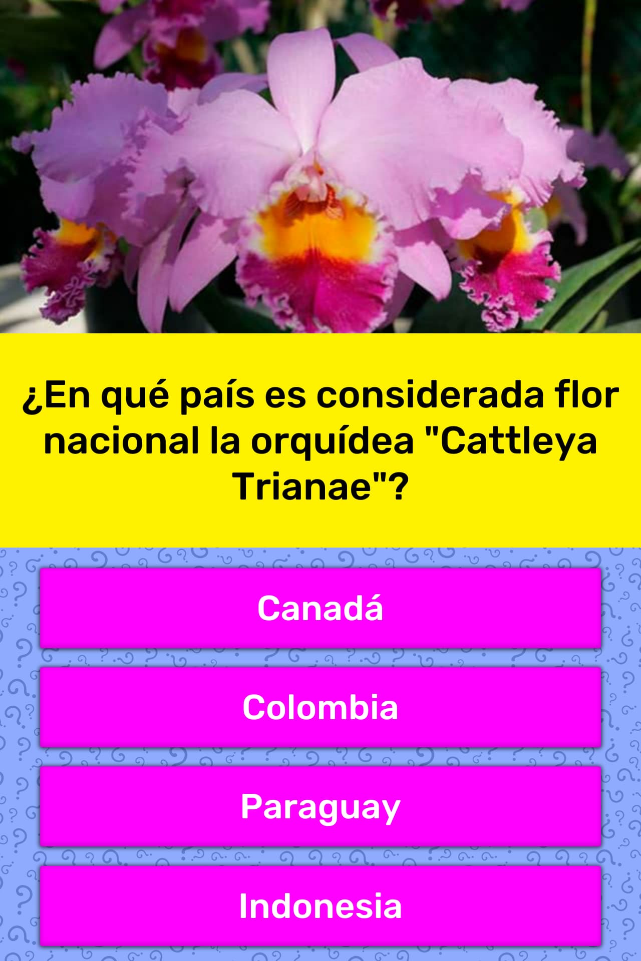 La cattleya trianae es una maravillosa representacion de las orquideas colombianas, esta es bastante conocida sus llamativos colores y duracion, posee hojas carnosas y es conciderada la flor nacional.